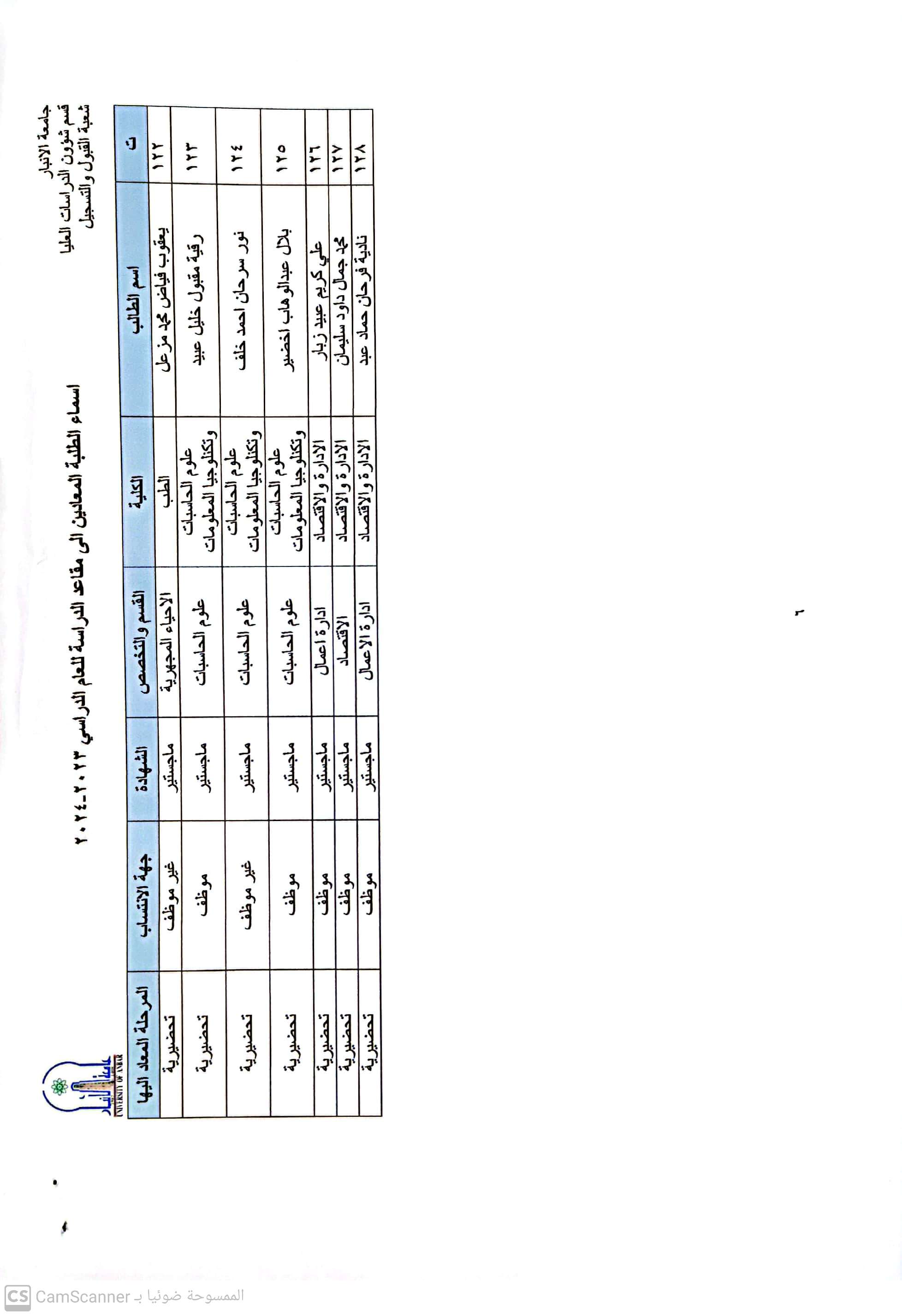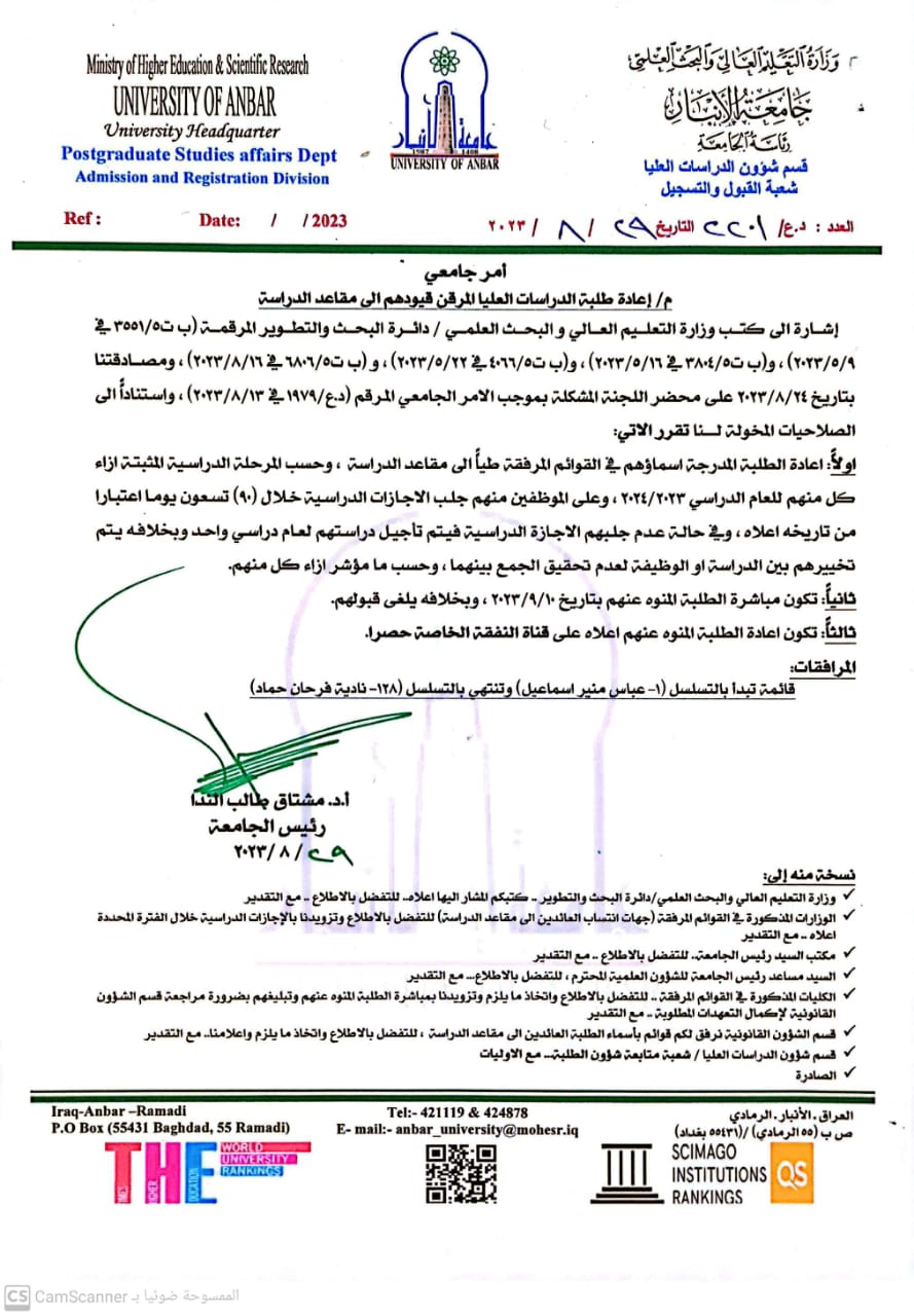 ادناه الامر الجامعي بعودة طلبة الدراسات العليا المرقنة قيودهم